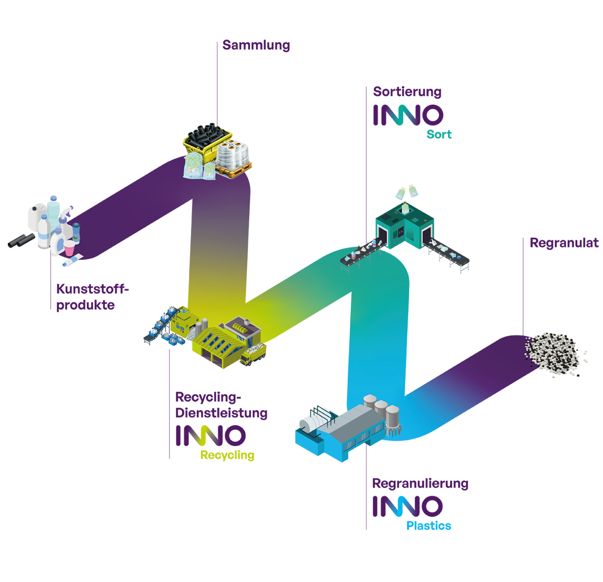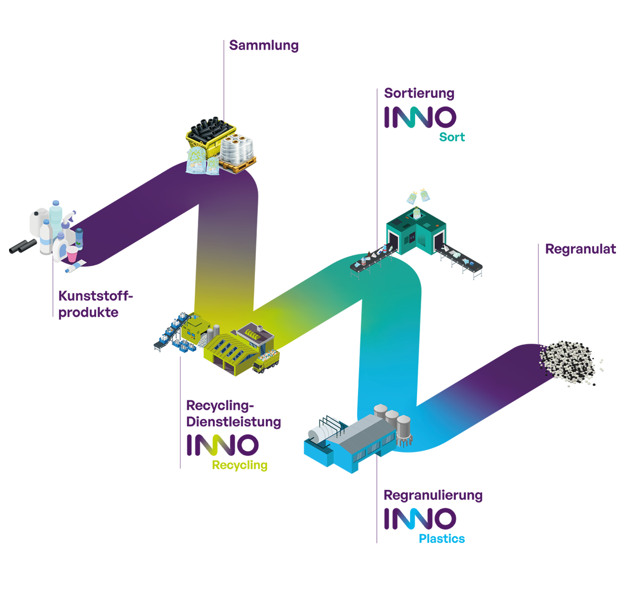 Kunststoffprodukte allgemein und Verpackungen im Speziellen haben eine kurze Lebensdauer – lediglich wenige Wochen von der Produktion bis zur Entsorgung. Da Kunststoff ein wertvoller Rohstoff ist, sollte er nicht einfach verbrannt werden. Durch gezieltes Sammeln sowie einer sortenreinen Triage und Weiterverarbeitung können Kunststoffe mehrmals recycelt werden. Die Sammlung und Beschaffung der Kunststoffabfälle steht somit am Anfang unseres InnoWay.